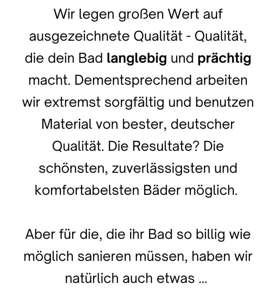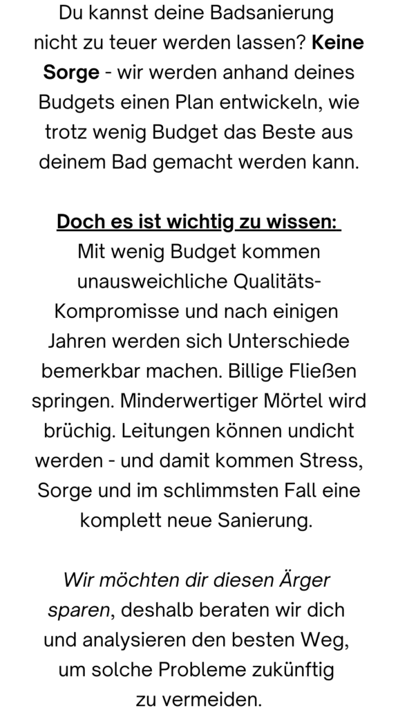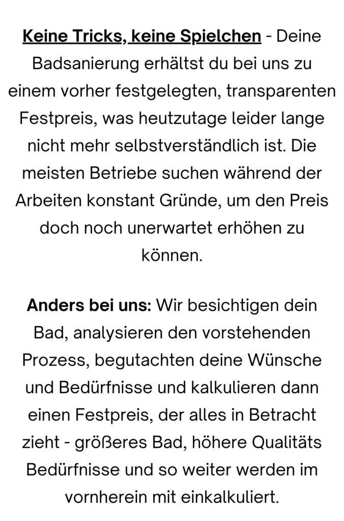Nein. Wir besichtigen dein Bad, nehmen deine Bedürftnisse und Wünsche in Betracht und analysieren dann einen so genau wie möglichen Festpreis, an den wir uns auch halten.